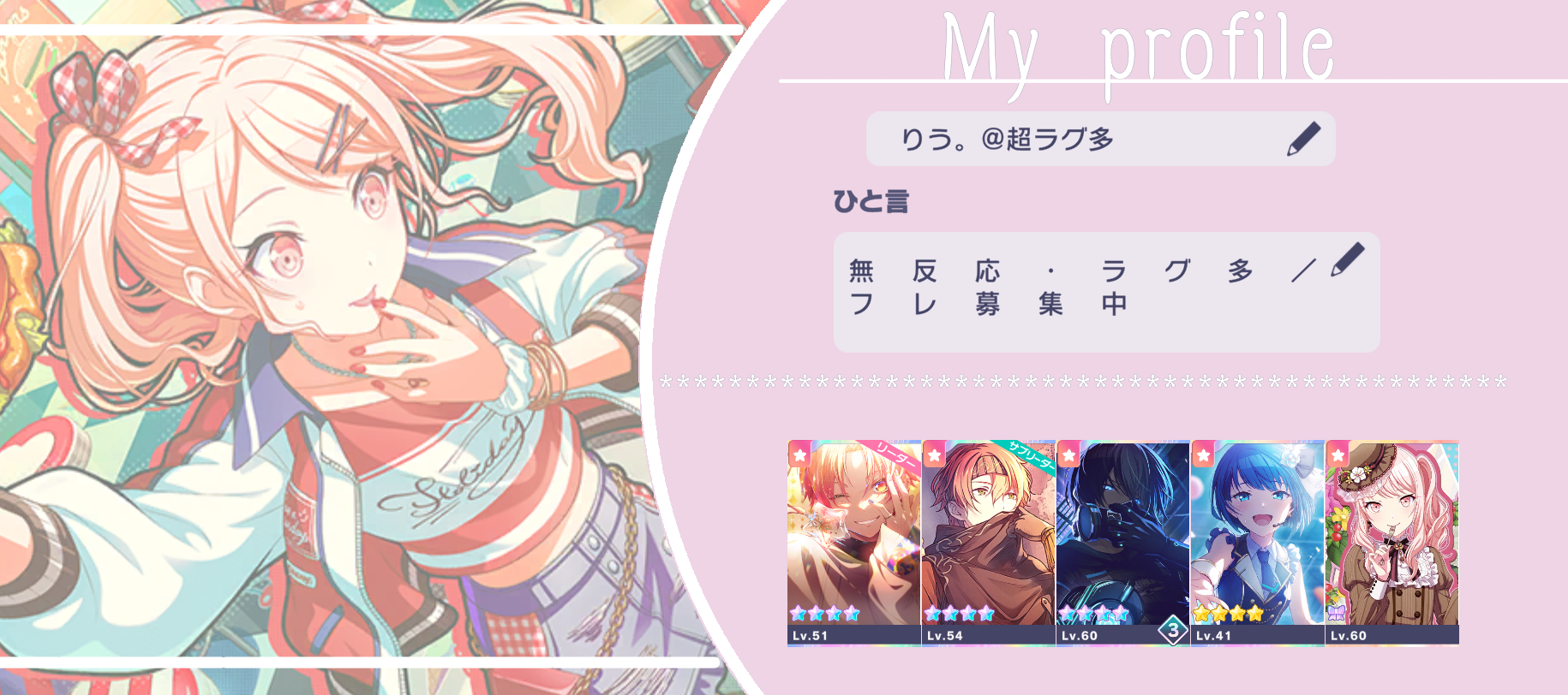フルコンエキスパ187master31一歌推し_キャラクターランク39 リン推し_キャラクターランク27 コメントにlD書いてくださいお迎え行きます♪ 質問ありましたら1日中に答えさせていただきます! プロフ作ったりしてる人です! 注意↓の写真見てからでお願いします!